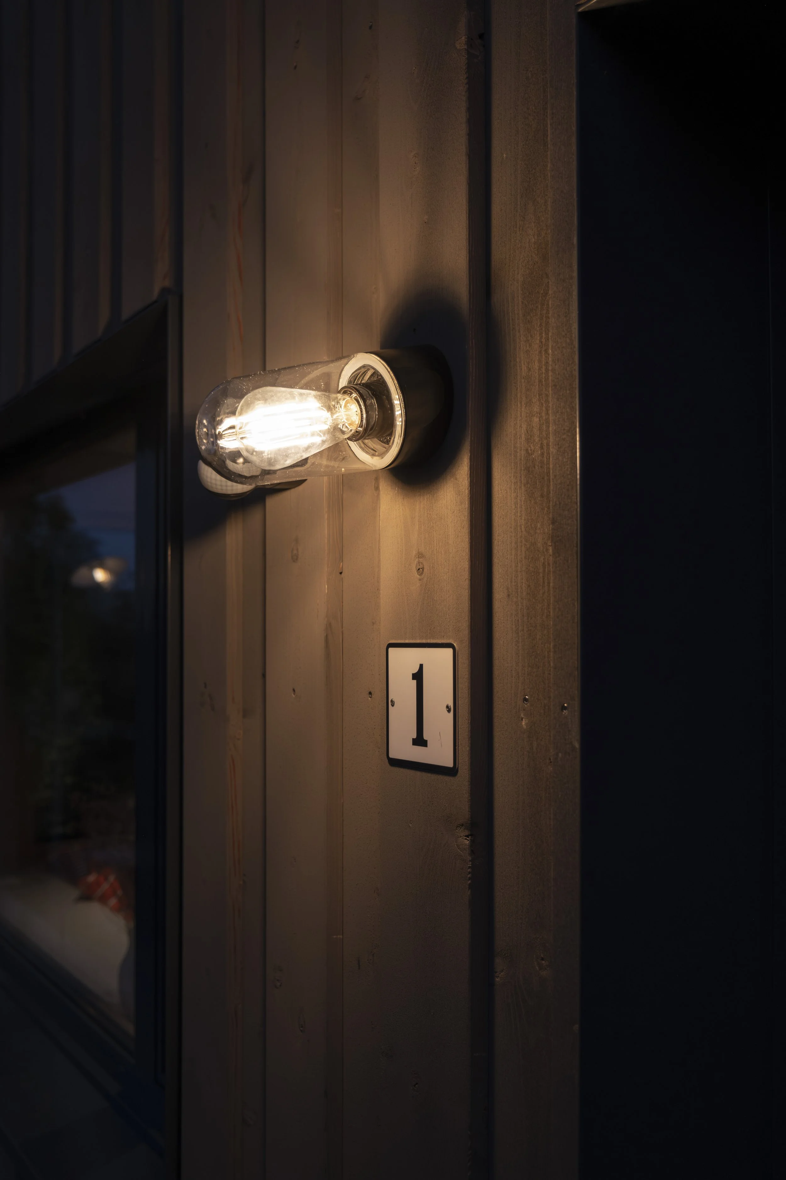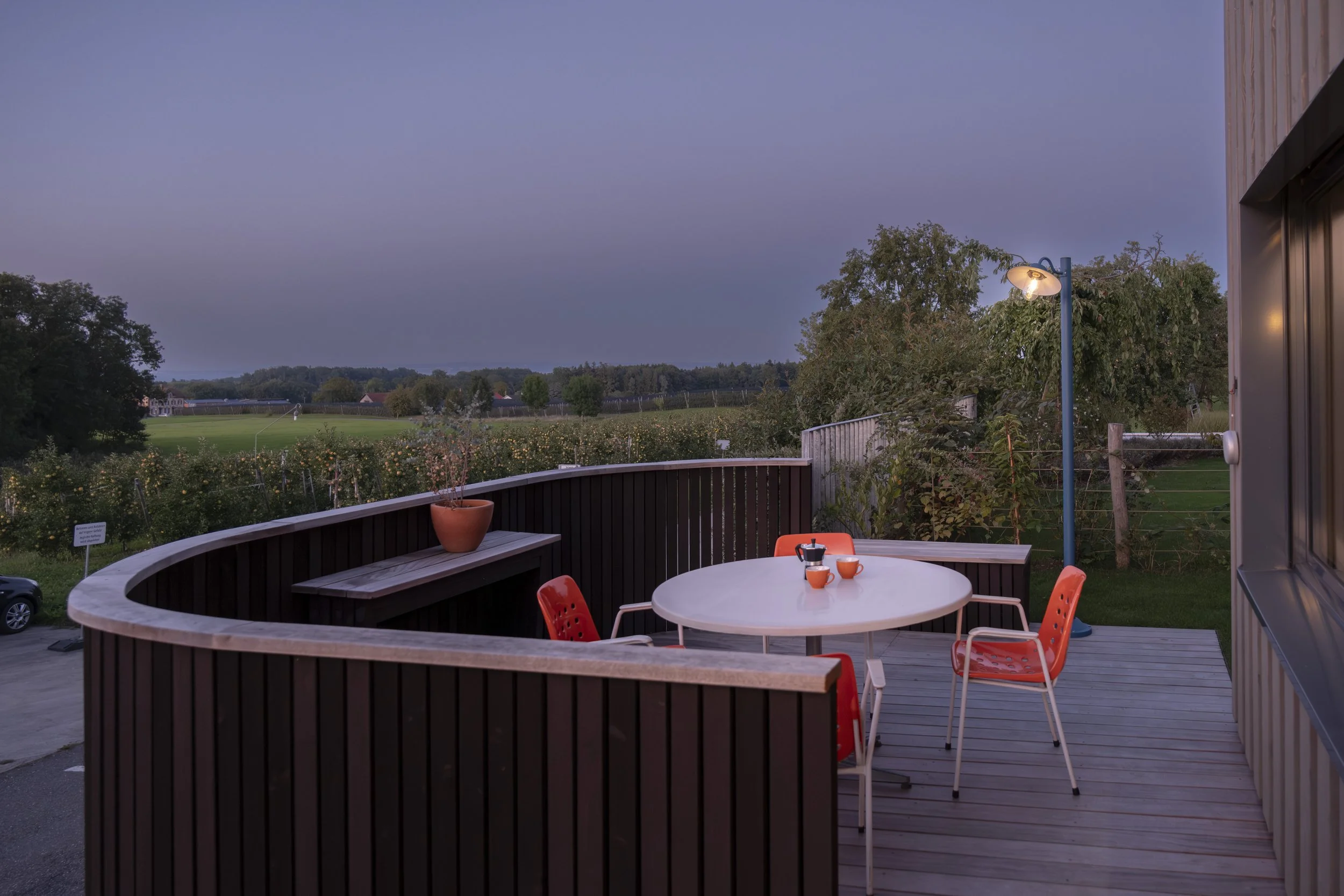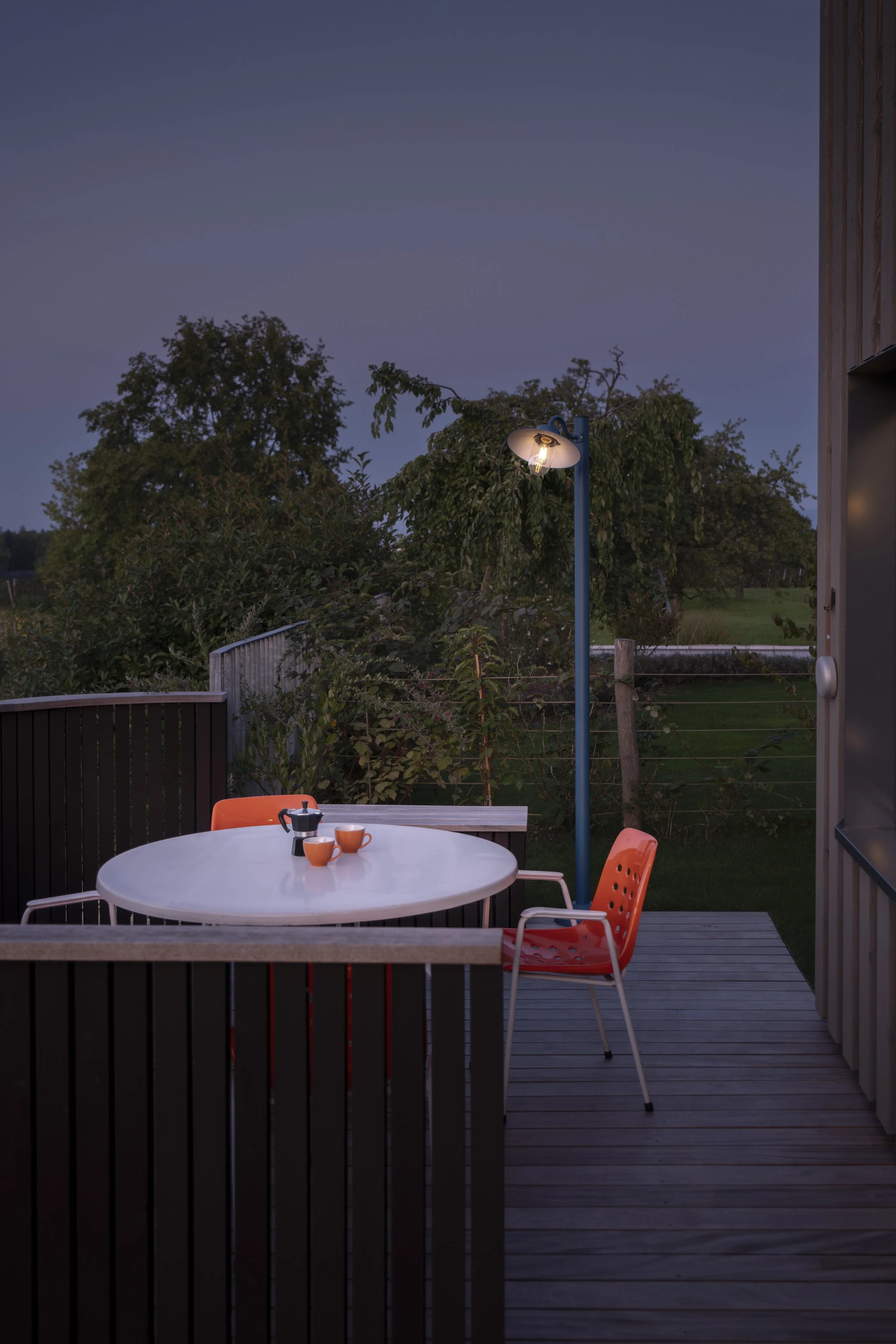 Man schütte Erde auf, ebne den steilen Hang, nehme Holzltten, tauche sie in Falun Vapen Farbe, reihe eine Latte an die andere und forme so einen Halbkreis. Lattung mit Holzabdeckung versehen, Holzrost auf dem Boden montieren, bestehende Treppe mit elegantem, rundem Geländer ergänzen. Und schon ist da die Veranda, das “Bellevue”.