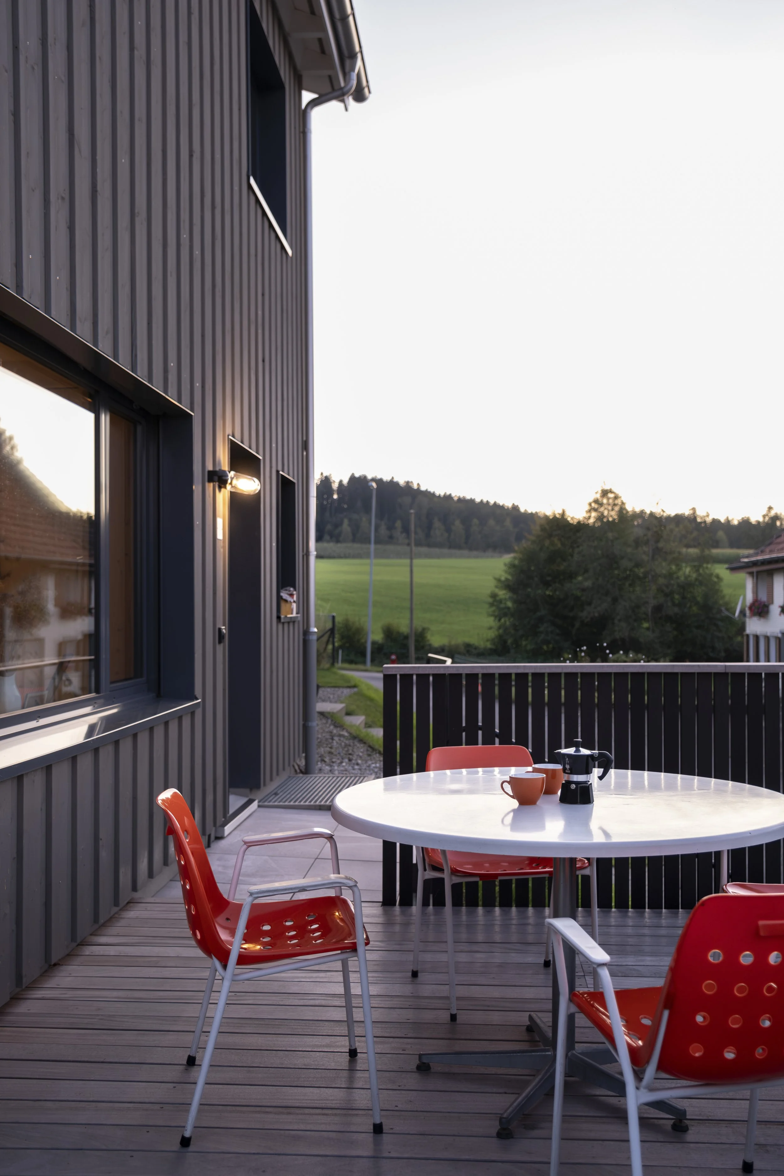 Also machte ich mich mit dem E-Bike auf den überschaubaren Weg – Esserswil, wo das Haus der Familie steht, liegt nur 500 Meter von meinem Büro entfernt. Dort angekommen, wurde mir sofort klar, weshalb die beiden unter die Sonne sitzen und ins Weite blicken möchten: der See, der Wald, die Felder und Apfelbäume, alles auf einen Blick.